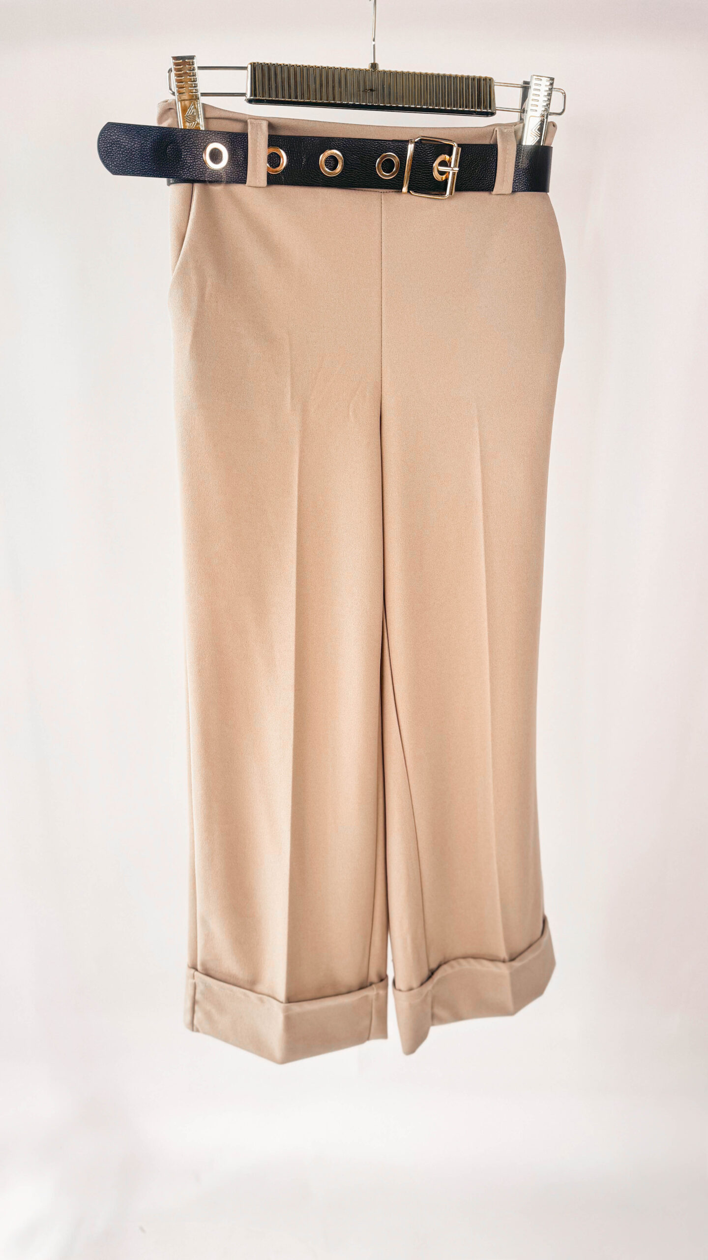Beżowe spodnie z paskiem wykończone mankietem przed kostkę. Dodadzą każdej stylizacji szyku i elegancji.
