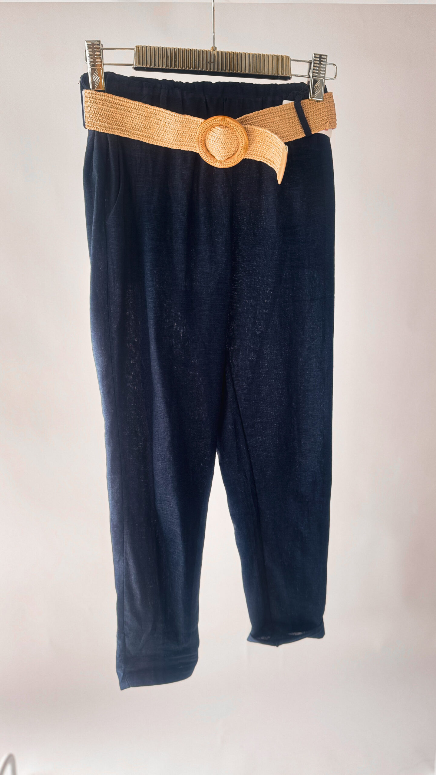 Przewiewne, granatowe spodnie, zapewniające lekkość i komfort. Nasze lniano- wiskozowe spodnie to idealny wybór zarówno do eleganckiej jak i codziennej stylizacji