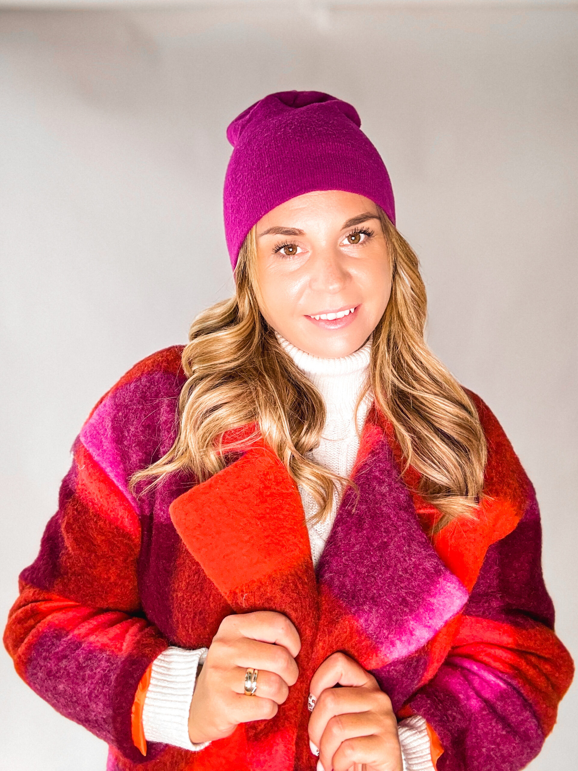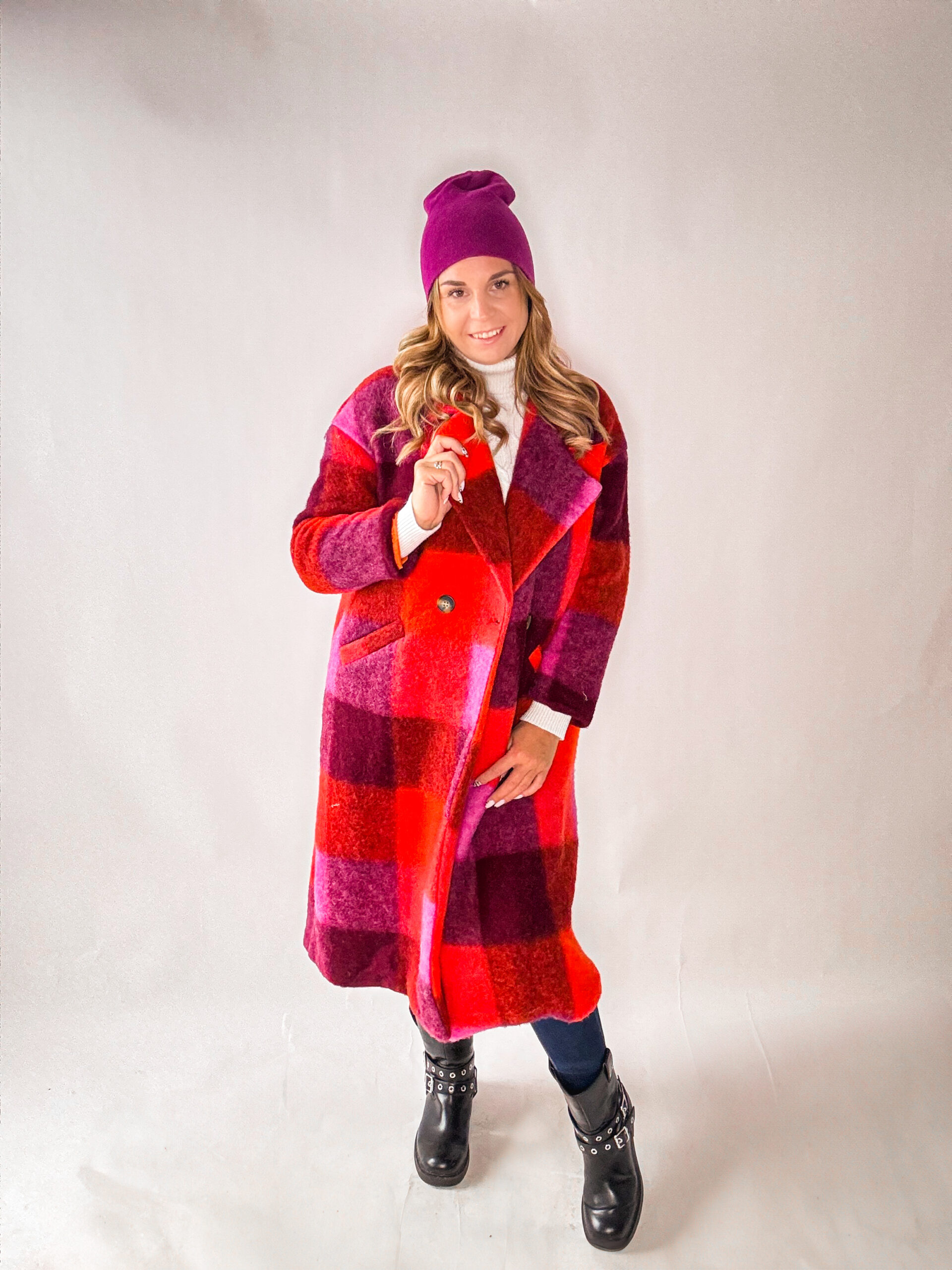 Oversizowy płaszcz w kratę w energetycznych odcieniach pomarańczy, różu i fioletu. Z większościowym składem wełny dzięki czemu jest ciepły zatem idealnie nadaje się zarówno na jesień jak i zimę.