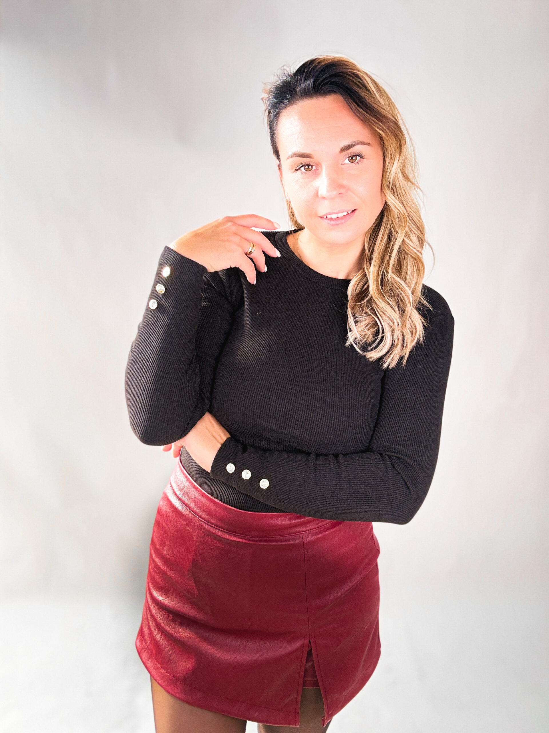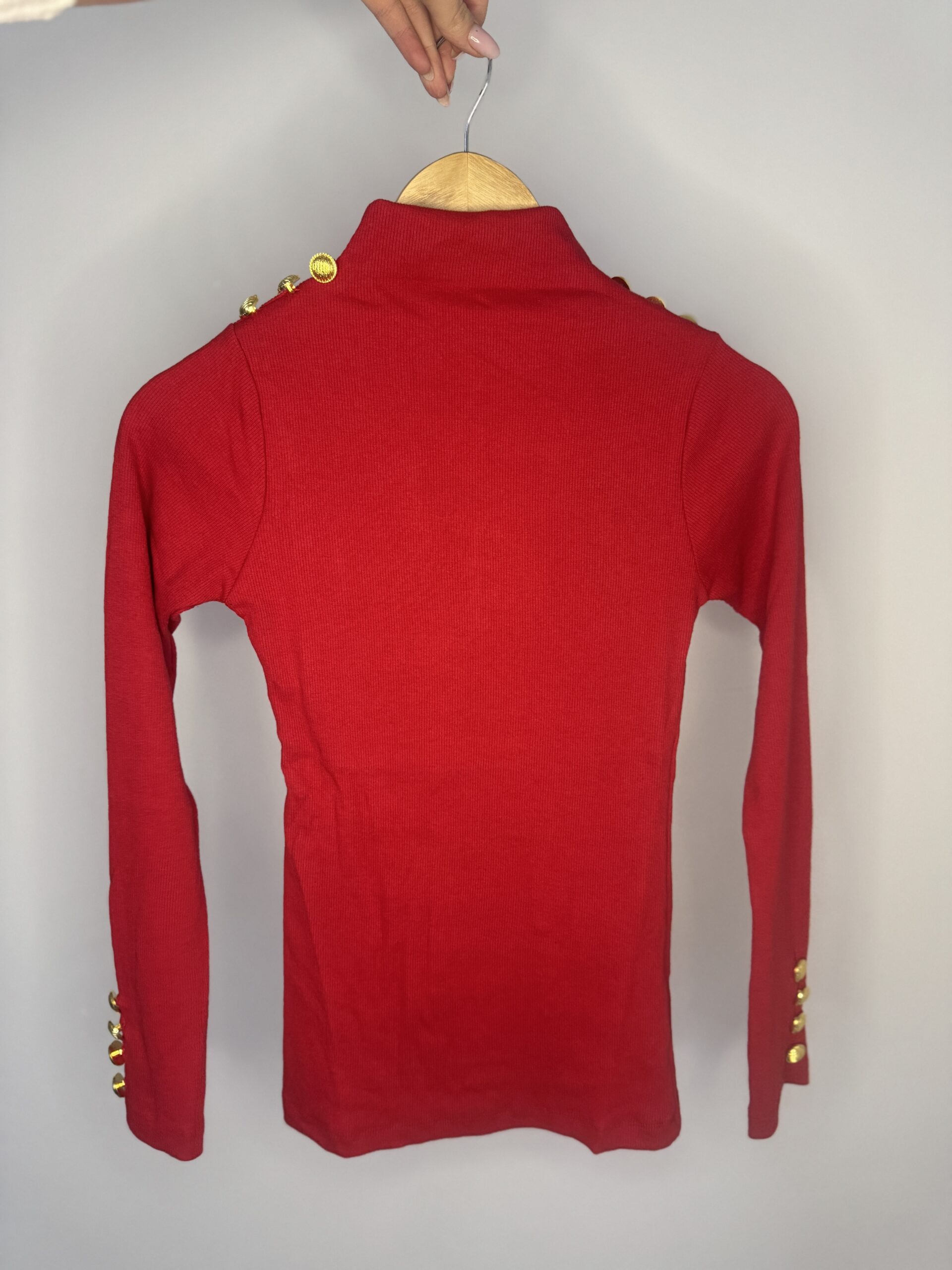 Czerwony półgolf z trzema ozdobnymi guzikami na ramionach oraz końcach rękawów. Basic’owa propozycja, która sprawdzi się w wielu stylizacjach.