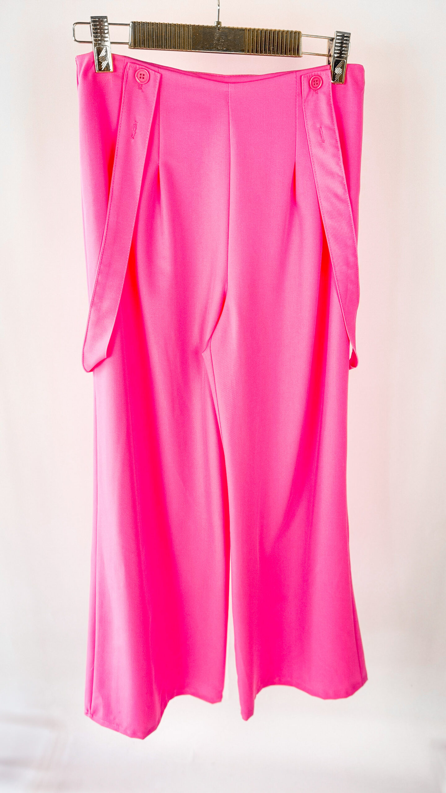 Spodnie w cukierkowym odcieniu różu z regulowanymi szelkami. Idealnym dopełnieniem stylizacji będzie nasza różowa kamizelka.