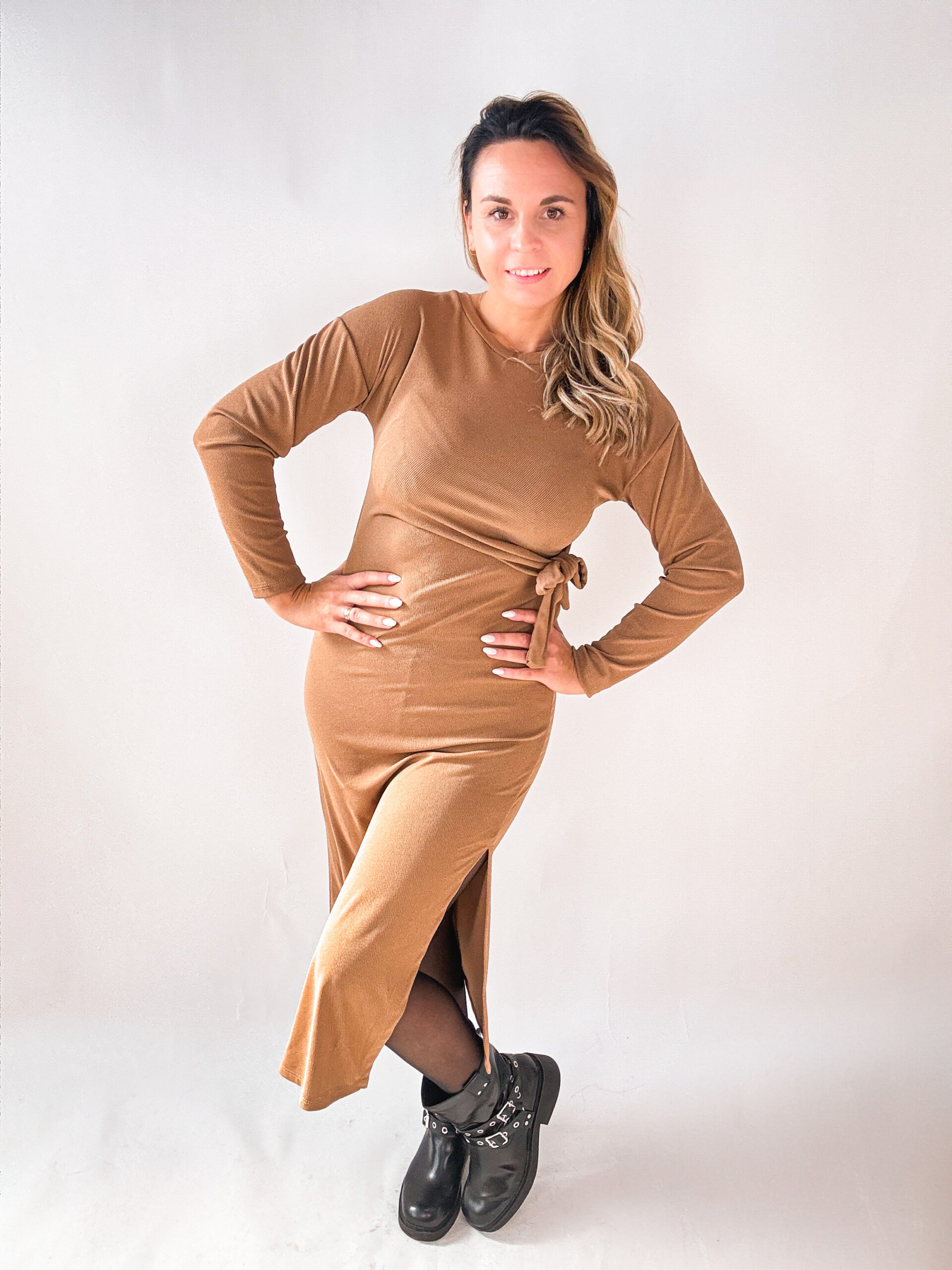 Sukienka midi z efektownym rozporkiem oraz nietuzinkowym wiązaniem z bardzo przyjemnej prążkowanej dzianiny. Idealna do jesiennych stylizacji. U nas dostępna w hitowych tej jesieni odcieniach burgundu, karmelu oraz koniaku.