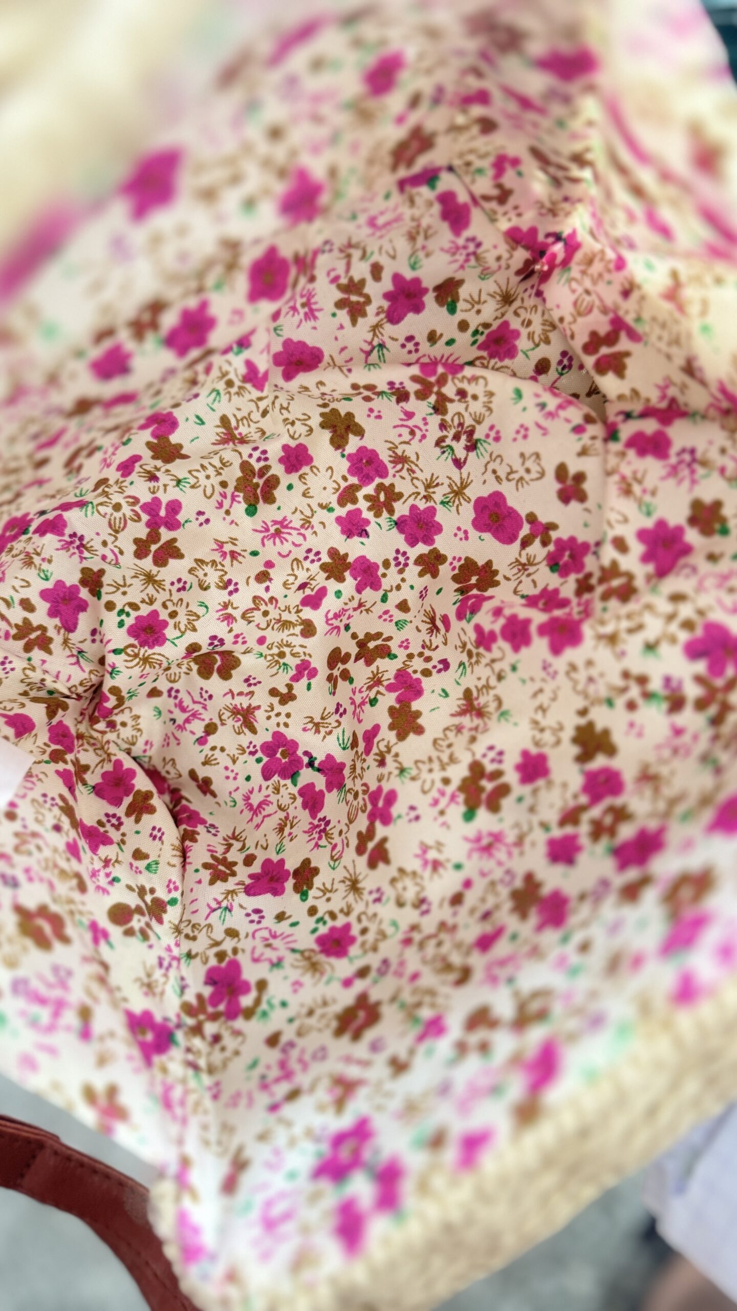 Bardzo ciekawa wersja wiklinowej torebki. Prostokątny, sztywny koszyk na długim, regulowanym pasku w koniakowym odcieniu brązu. Środek obszyty przepiękną tkaniną z kwiatowym printem.